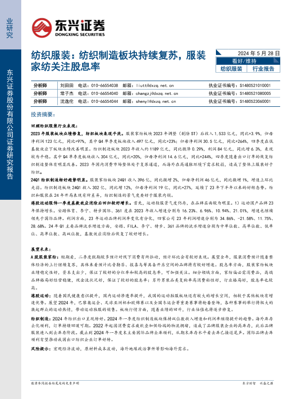 【东兴证券】【20240528】纺织服装行业报告:纺织制造板块持续复苏,服装家纺关注股息率-10页