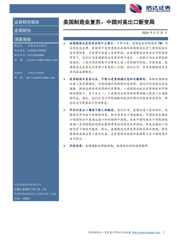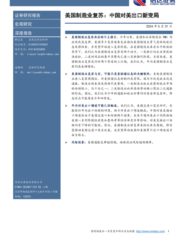【信达证券】【20240531】美国制造业复苏:中国对美出口新变局-25页