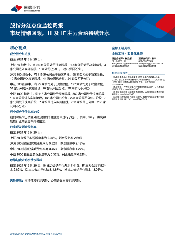 【国信证券】【20240529】股指分红点位监控:市场情绪回暖,IH及IF主力合约持续升水-17页
