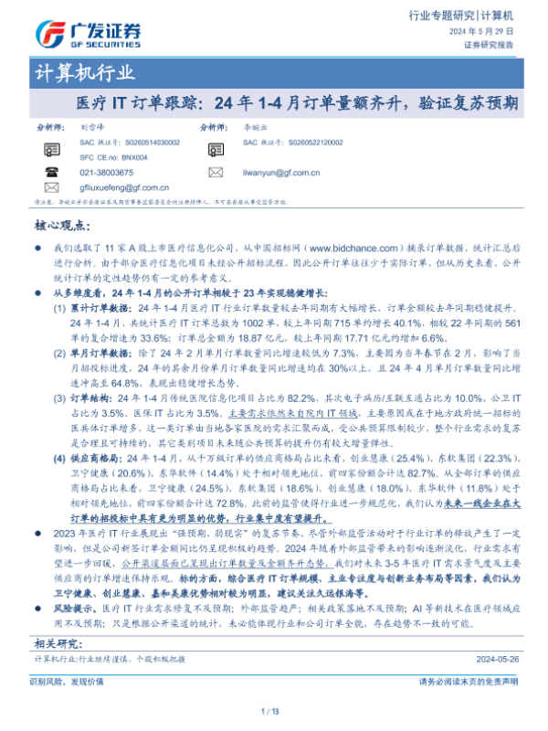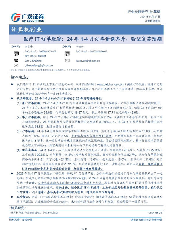 【广发证券】【20240529】计算机行业医疗IT订单跟踪:24年1-4月订单量额齐升,验证复苏预期-13页