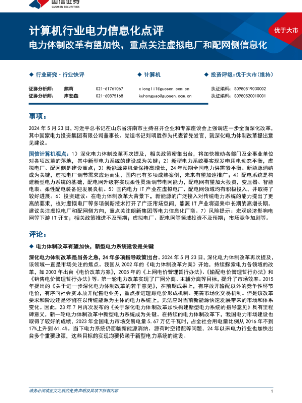 【国信证券】【20240528】计算机行业电力信息化点评:电力体制改革有望加快,重点关注虚拟电厂和配网侧信息化-12页