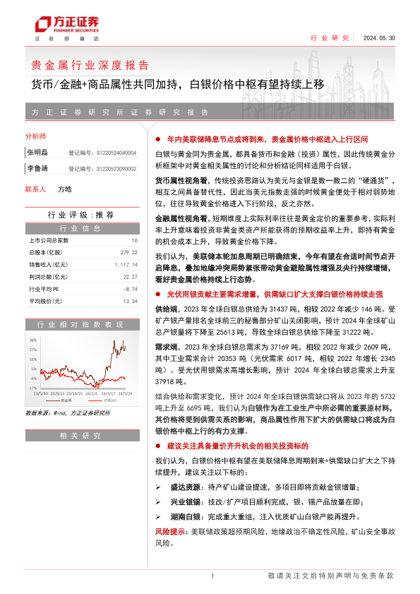 【方正证券】【20240530】贵金属行业深度报告:货币/金融+商品属性共同加持,白银价格中枢有望持续上移-14页