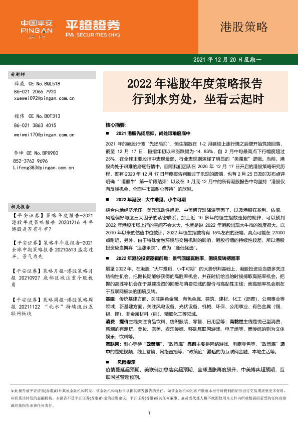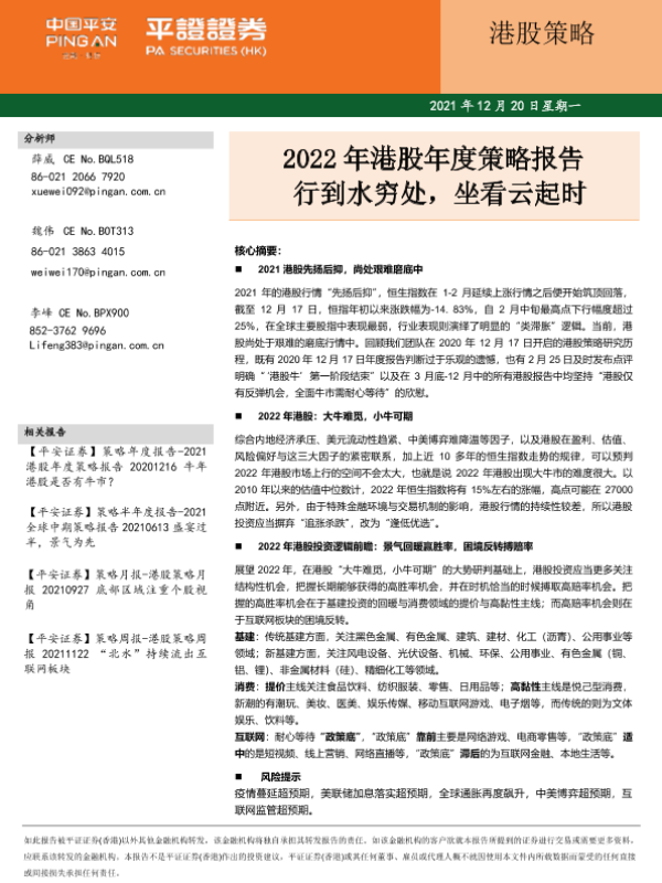 【平安证券(香港)】【20211220】2022年港股年度策略:行到水穷处,坐看云起时-21页