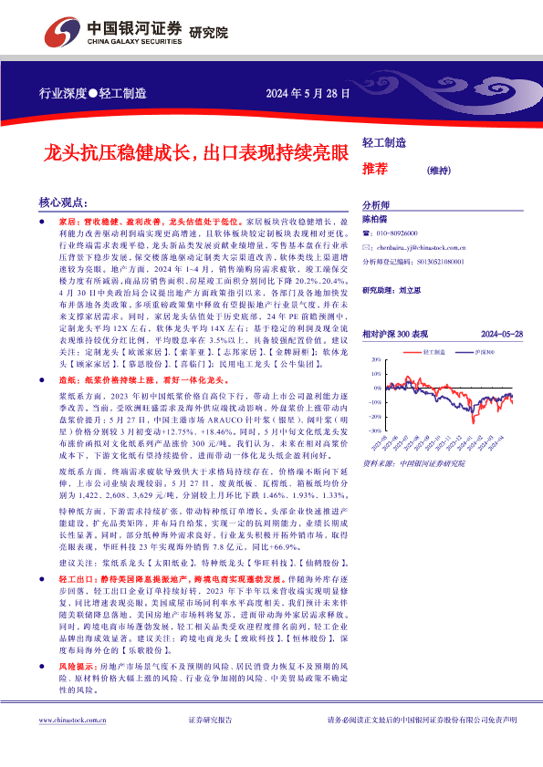 【银河证券】【20240528】轻工制造行业深度:龙头抗压稳健成长,出口表现持续亮眼-20页