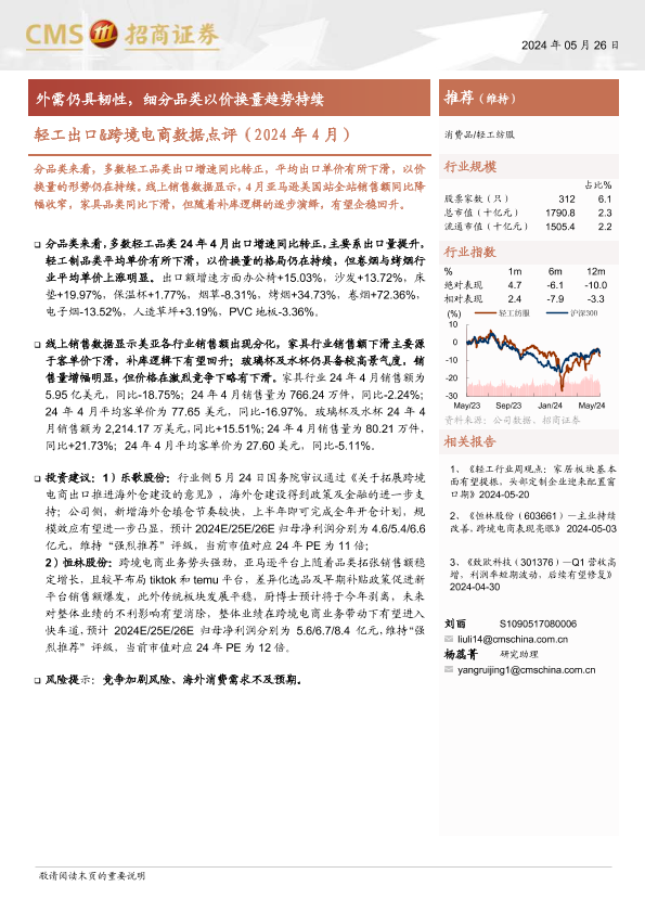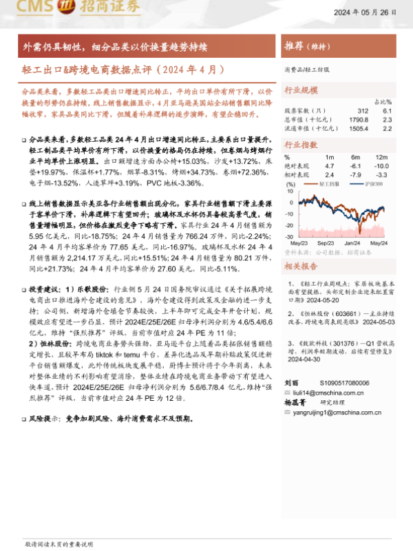 【海通证券】【20240526】轻工出口&跨境电商数据点评(2024年4月):外需仍具韧性,细分品类以价换量趋势持续-10页