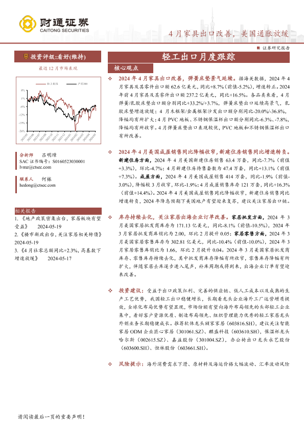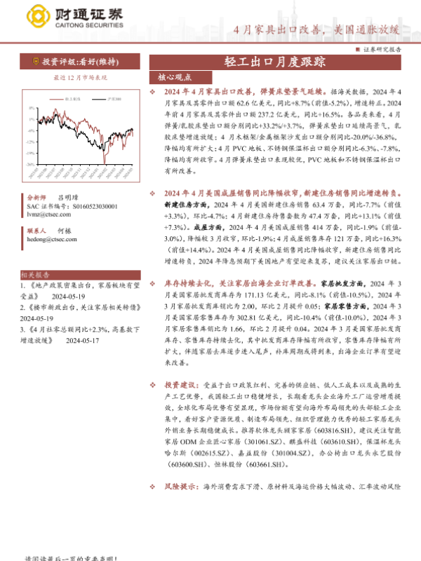 【财通证券】【20240524】轻工制造行业轻工出口月度跟踪:4月家具出口改善,美国通胀放缓-17页