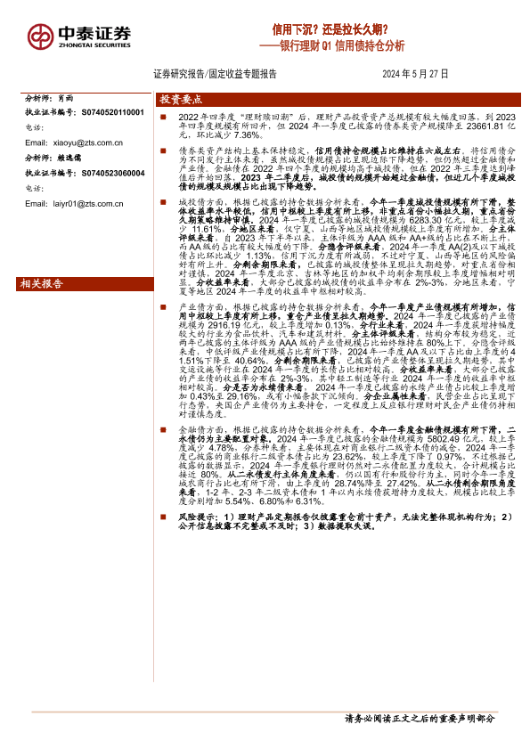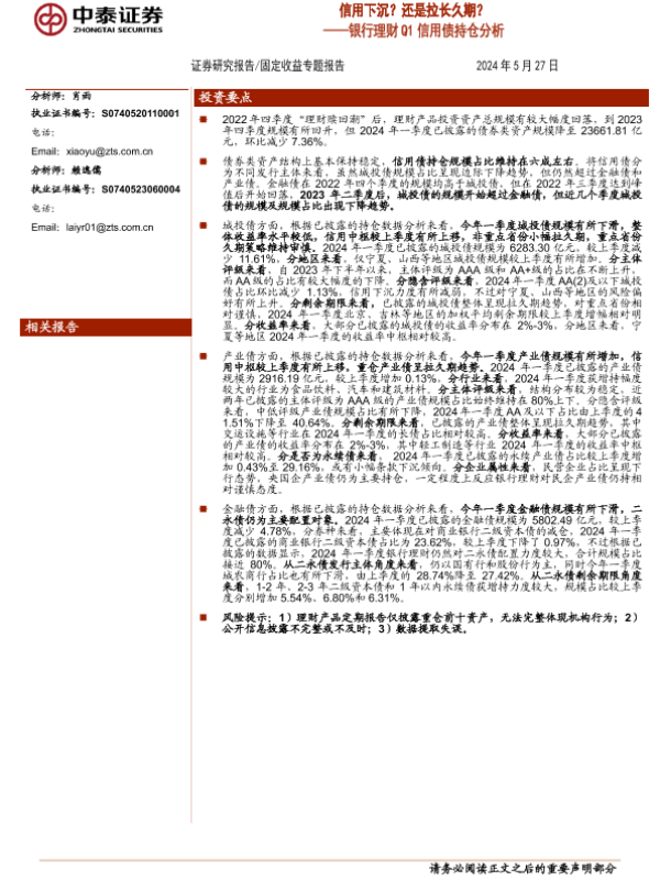 【中泰证券】【20240527】银行理财Q1信用债持仓分析:信用下沉?还是拉长久期?-20页