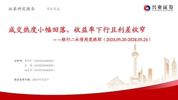 【兴业证券】【20240526】银行二永债跟踪:成交热度小幅回落,收益率下行且利差收窄-40页