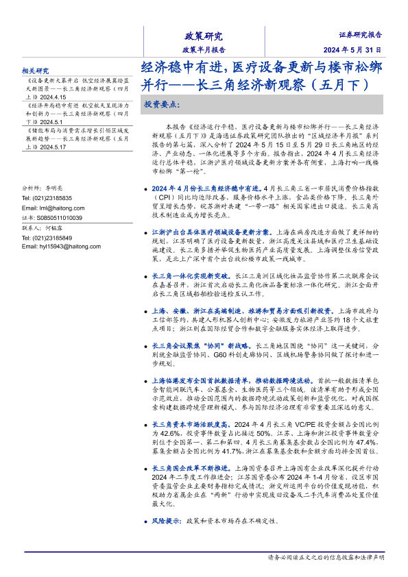 【海通证券】【20240531】长三角经济新观察(五月下):经济稳中有进,医疗设备更新与楼市松绑并行-16页