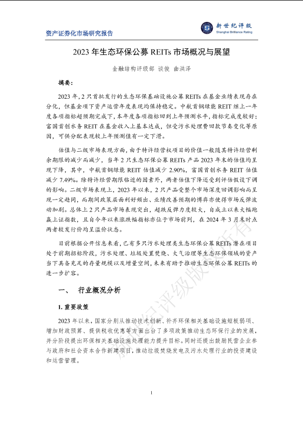 【金融结构评级部】【20230101】2023年生态环保公募REITs市场概况与展望-15页