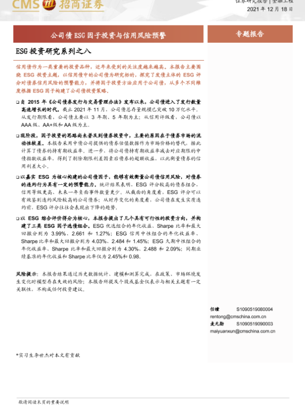 ESG投资 信用风险 公司债 因子投资 量化选债策略