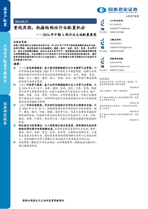 【国泰君安证券】【20240621】2024年中期A股行业主动配置展望:重视周期,把握结构性行业配置机会-10页