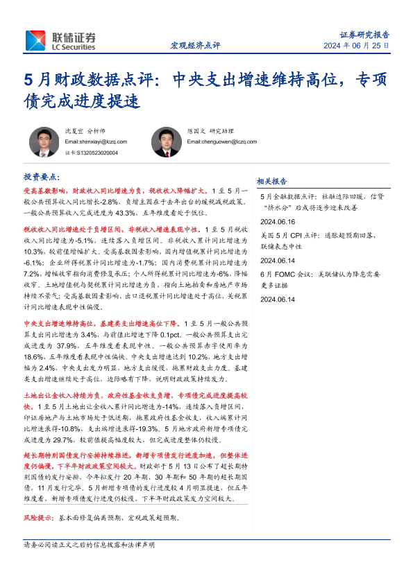 【联储证券】【20240625】5月财政数据点评:中央支出增速维持高位,专项债完成进度提速-14页