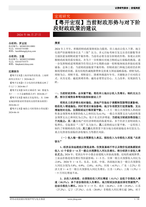 【粤开证券】【20240627】当前财政形势与对下阶段财政政策的建议-18页