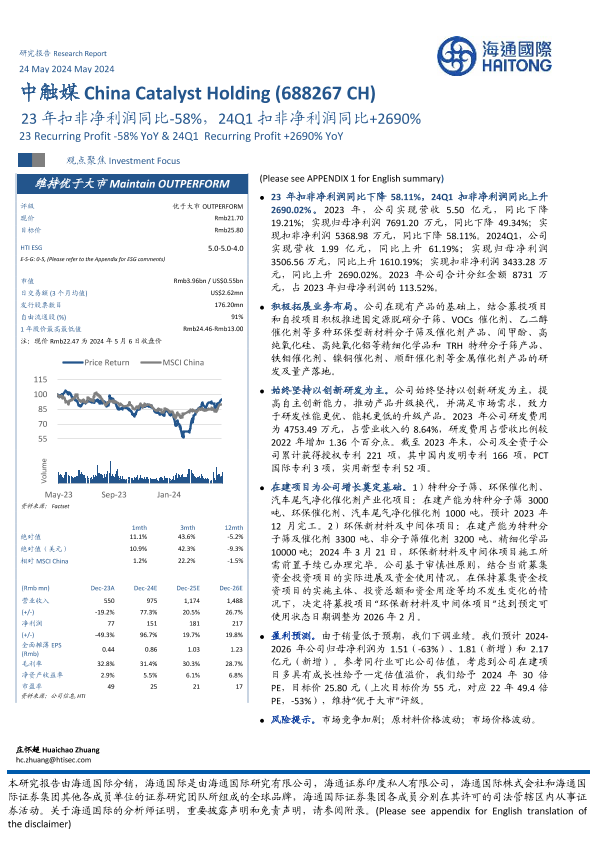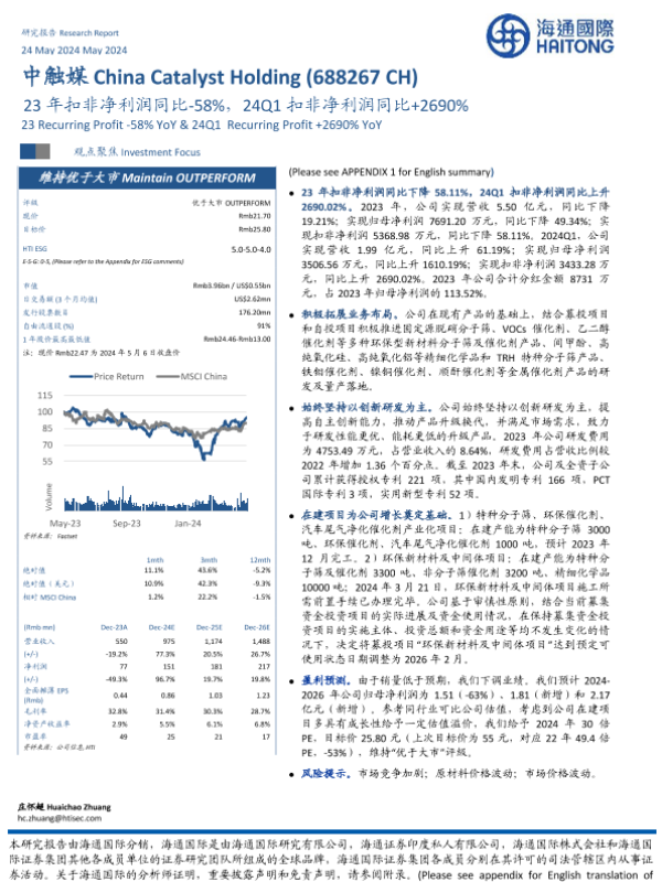 【海通国际】【20240524】中触媒-688267.SH-23年扣非净利润同比-58%,24Q1扣非净利润同比+2690%-12页