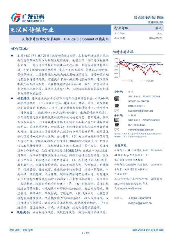 【广发证券】【20240623】互联网传媒行业:头部影片陆续定档暑期档,Claude+3.5+Sonnet性能亮眼-22页