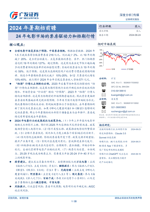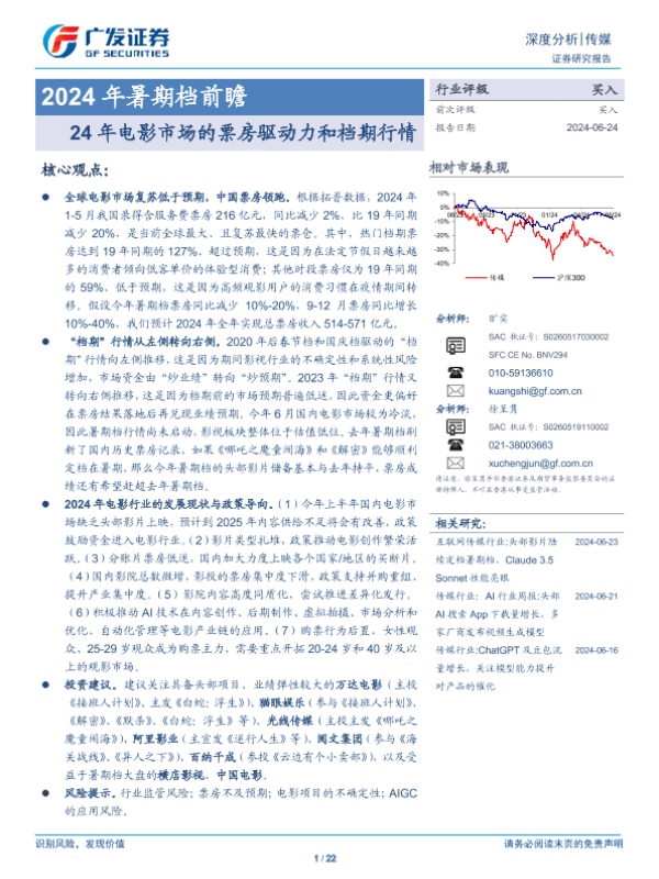 【广发证券】【20240624】传媒行业2024年暑期档前瞻:24年电影市场的票房驱动力和档期行情-22页