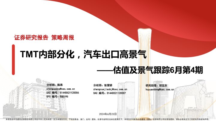 【中信建投证券】【20240623】估值及景气跟踪6月第4期:TMT内部分化,汽车出口高景气-28页