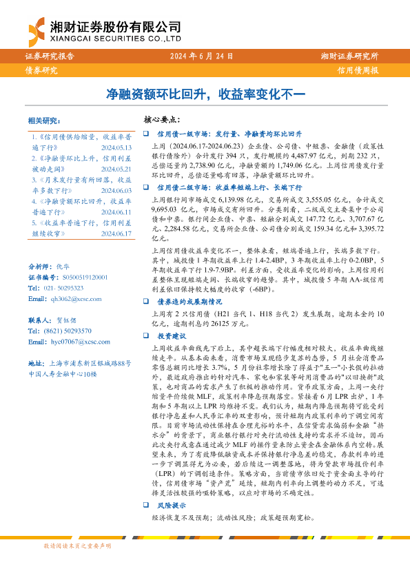 【湘财证券】【20240624】信用债:净融资额环比回升,收益率变化不一-10页