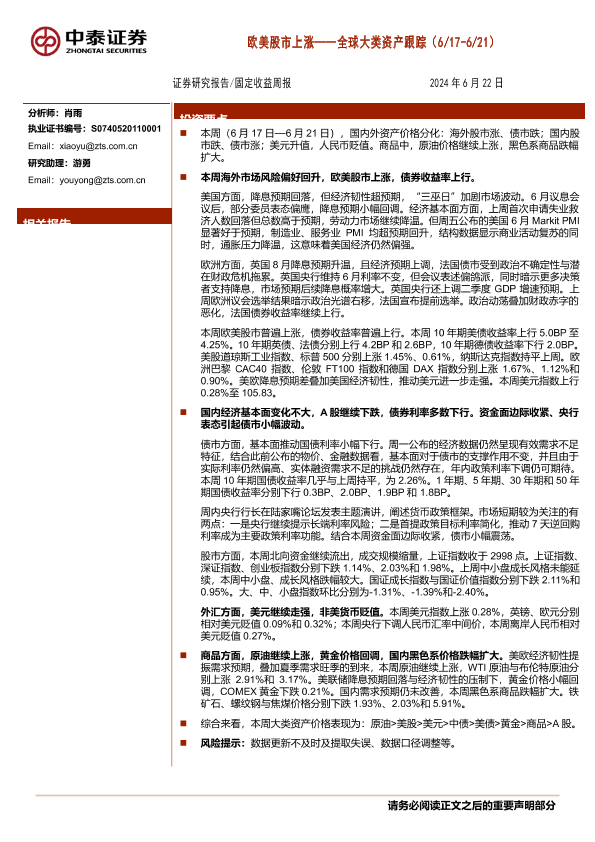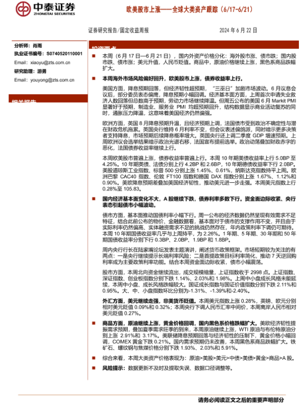 【中泰证券】【20240622】全球大类资产跟踪:欧美股市上涨-19页