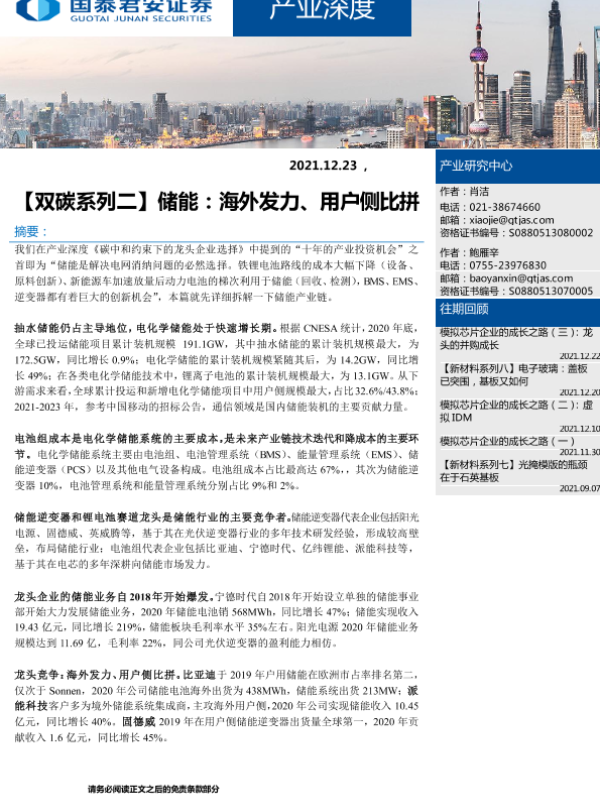【国泰君安证券】【20211223】产业深度:【双碳系列二】储能,海外发力、用户侧比拼-23页