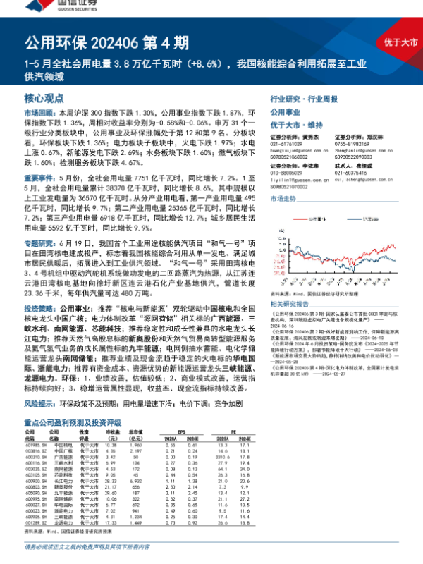 【国信证券】【20240623】公用环保行业202406第4期:1-5月全社会用电量3.8万亿千瓦时(+8.6%),我国核能综合利用拓展至工业供汽领域-27页