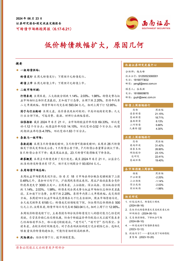 【西南证券】【20240623】可转债市场跟踪:低价转债跌幅扩大,原因几何-14页
