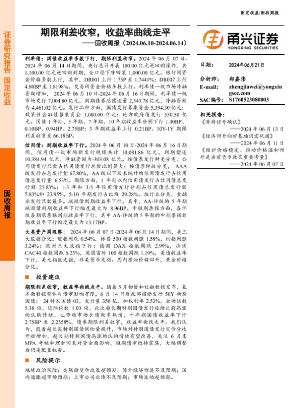 【甬兴证券】【20240621】固收:期限利差收窄,收益率曲线走平-17页