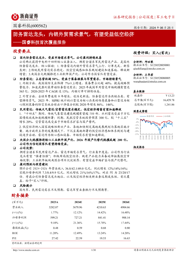 【浙商证券】【20240625】国睿科技(600562)首次覆盖报告:防务雷达龙头,内销外贸需求景气,有望受益低空经济-30页