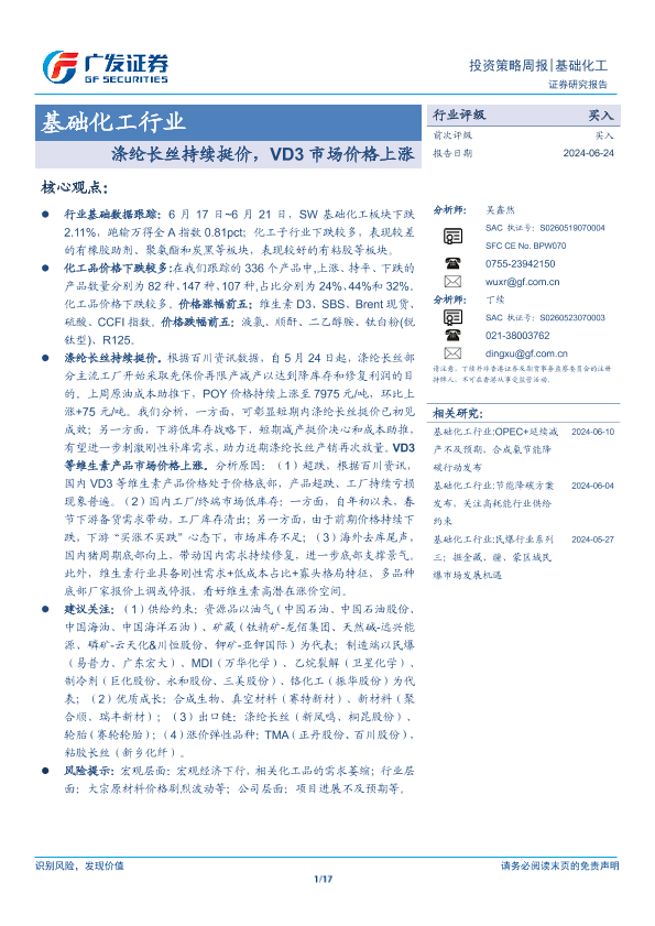 【广发证券】【20240624】基础化工行业:涤纶长丝持续挺价,VD3市场价格上涨-17页
