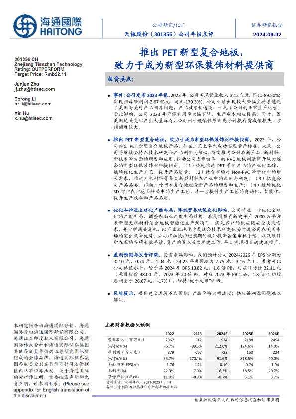 【海通国际】【20240602】天振股份-301356.SZ-公司年报点评:推出PET新型复合地板,致力于成为新型环保装饰材料提供商-11页
