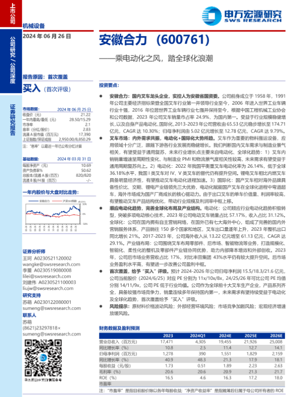 【申万宏源】【20240626】安徽合力(600761)乘电动化之风,踏全球化浪潮-40页