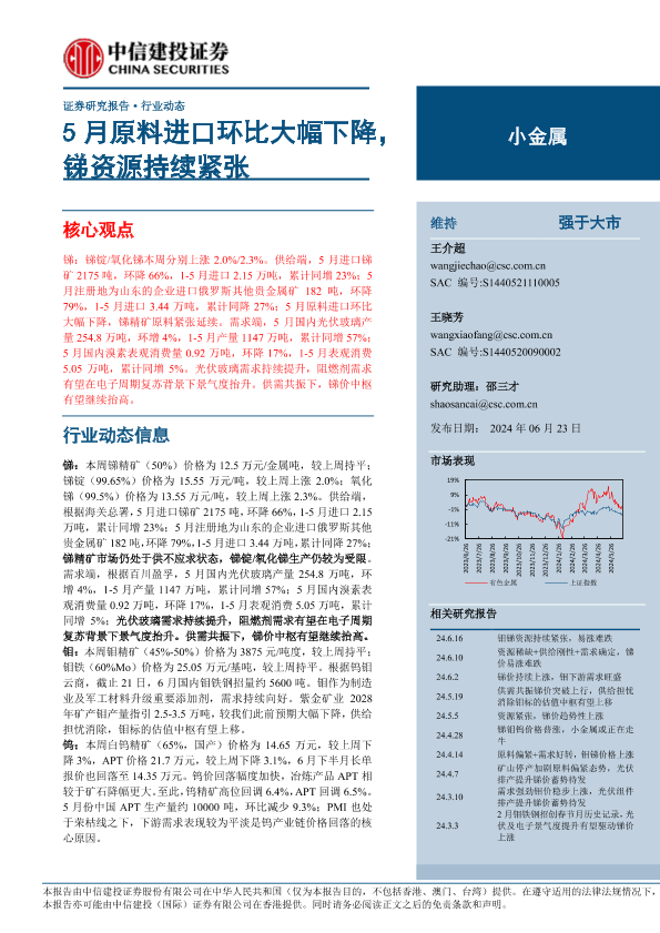 【中信建投证券】【20240623】小金属行业:5月原料进口环比大幅下降,锑资源持续紧张-10页
