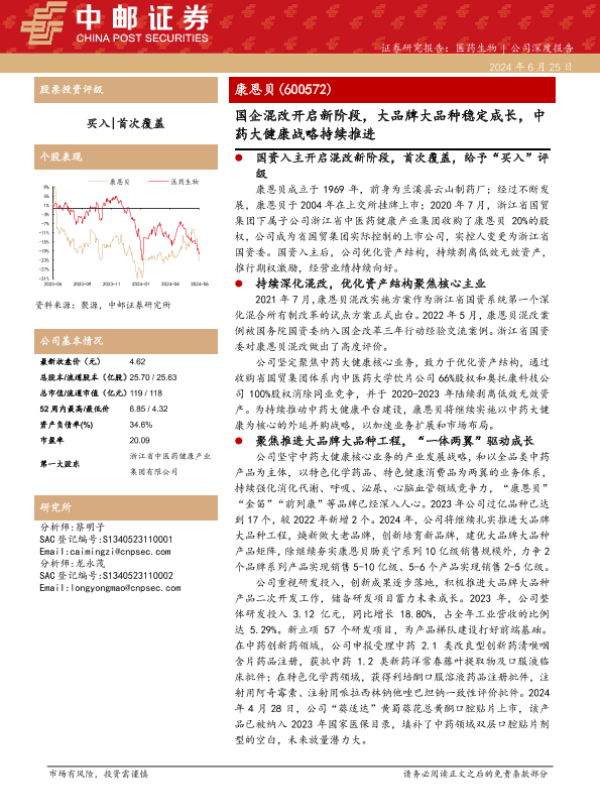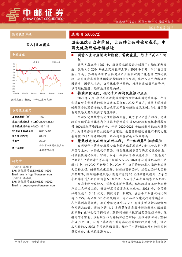 【中邮证券】【20240625】康恩贝(600572)国企混改开启新阶段,大品牌大品种稳定成长,中药大健康战略持续推进-28页