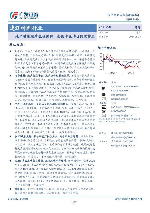 【广发证券】【20240623】建筑材料行业:地产增速继续低位徘徊,全国水泥均价同比转正-27页