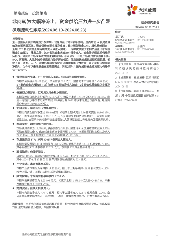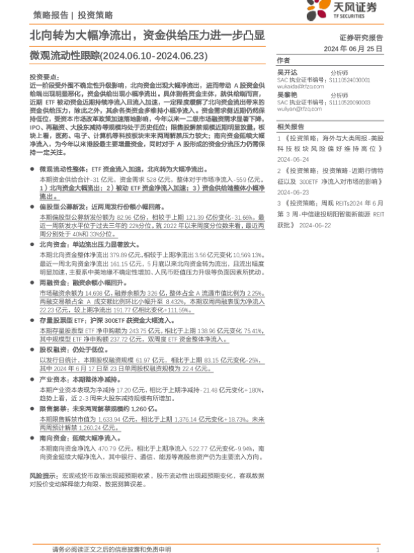 【天风证券】【20240625】微观流动性跟踪:北向转为大幅净流出,资金供给压力进一步凸显-15页