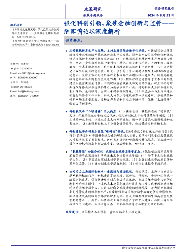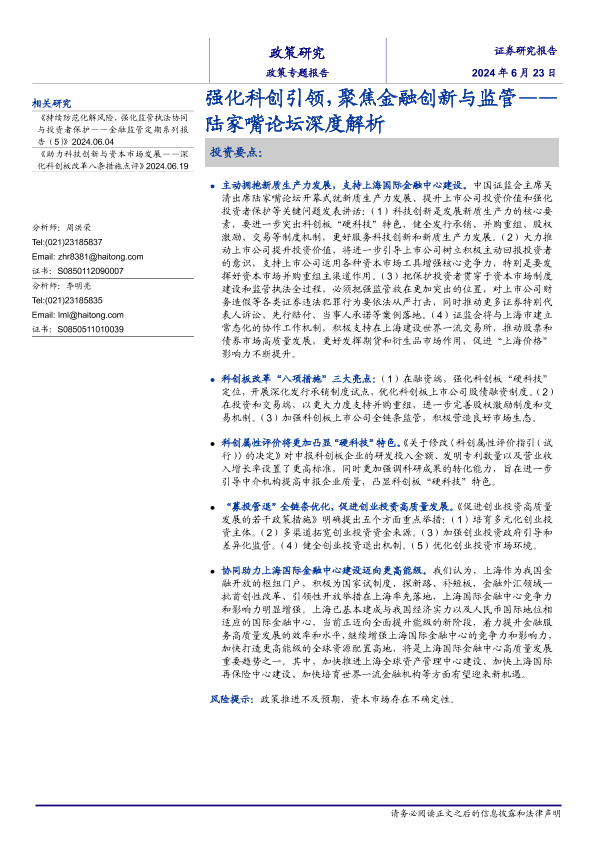 【海通证券】【20240623】政策专题报告:陆家嘴论坛深度解析,强化科创引领,聚焦金融创新与监管-14页