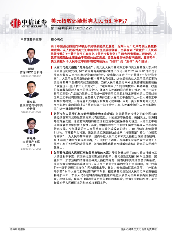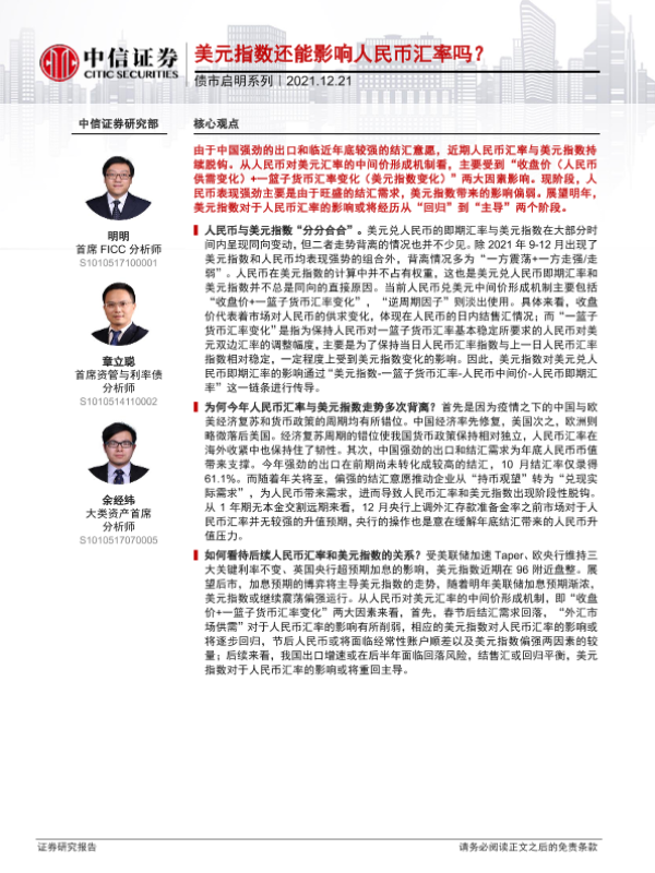 【中信证券】【20211221】债市启明系列:美元指数还能影响人民币汇率吗?-29页