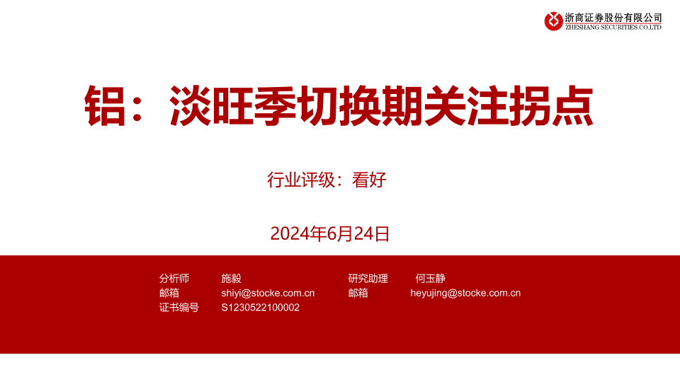 【浙商证券】【20240624】铝:淡旺季切换期关注拐点-12页