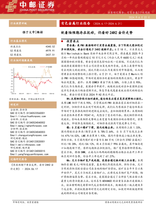 【中邮证券】【20240622】有色金属行业报告:软着陆预期存在扰动,仍看好24H2金价走势-14页