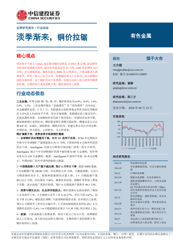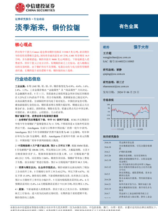 【中信建投证券】【20240623】有色金属行业:淡季渐来,铜价拉锯-12页