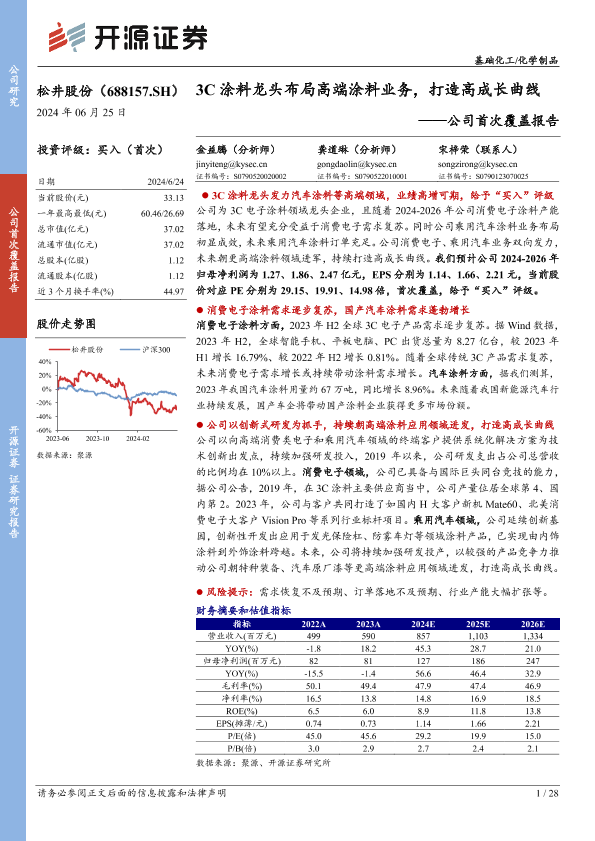 【开源证券】【20240625】松井股份(688157)公司首次覆盖报告:3C涂料龙头布局高端涂料业务,打造高成长曲线-28页