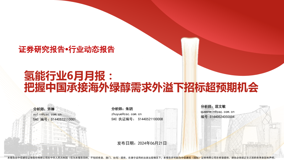 【中信建投证券】【20240621】氢能行业6月月报:把握中国承接海外绿醇需求外溢下招标超预期机会-23页