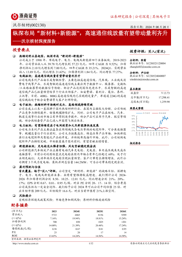 【浙商证券】【20240626】沃尔核材(002130)深度报告:纵深布局“新材料+新能源”,高速通信线放量有望带动量利齐升-32页