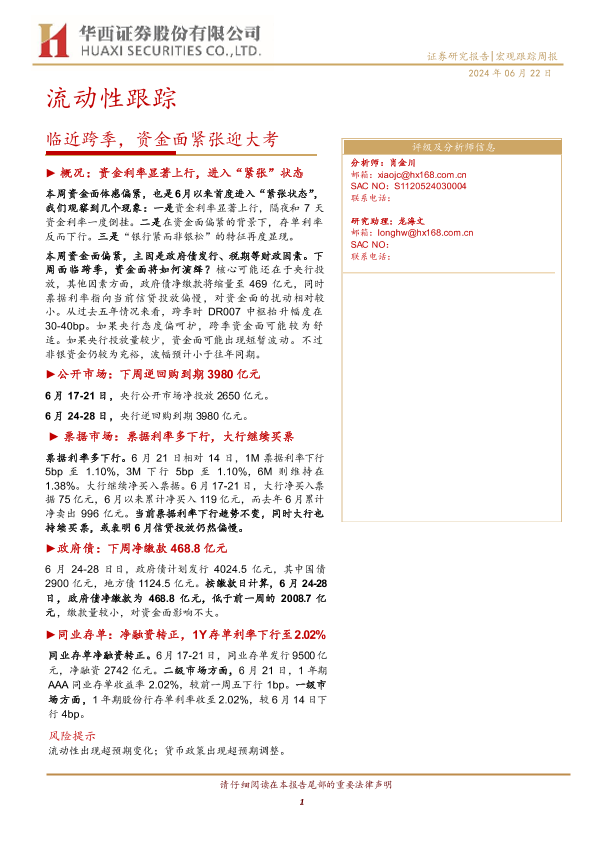 【华西证券】【20240622】流动性跟踪:临近跨季,资金面紧张迎大考-21页