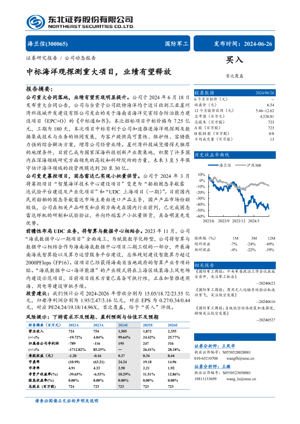 【东北证券】【20240626】海兰信(300065)中标海洋观探测重大项目,业绩有望释放-12页