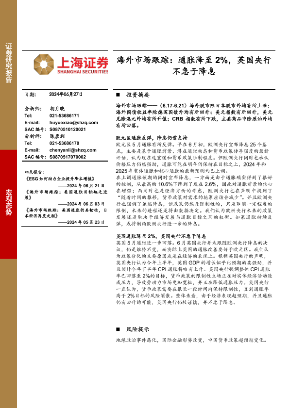 【上海证券】【20240627】海外市场跟踪:通胀降至2%,英国央行不急于降息-10页