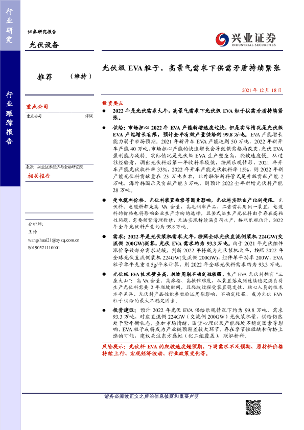 【兴业证券】【20211218】光伏级 EVA粒子,高景气需求下供需矛盾持续紧张-17页