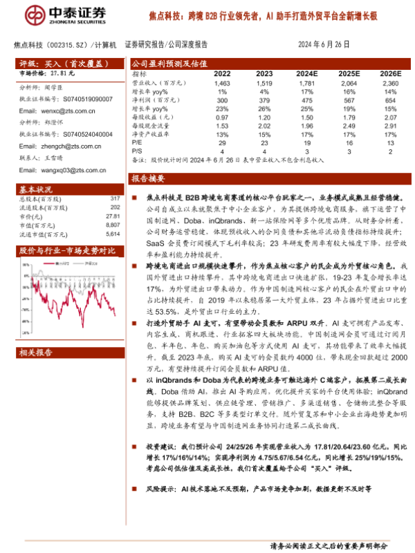 【中泰证券】【20240626】焦点科技(002315)焦点科技,跨境B2B行业领先者,AI助手打造外贸平台全新增长极-28页