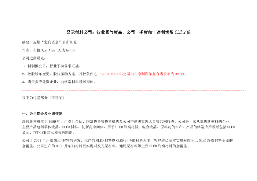 【市值风云】【20240613】瑞联新材-688550.SH-显示材料公司:行业景气度高,公司一季度扣非净利润增长近2倍-10页